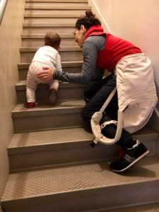 Grocery sacks spill down the stair