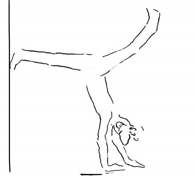 The other day one of these creepy little sadists gave me a swift kick in my solar plexus. Our teacher asked us to put our hands on the floor and kick our legs up into the air against a wall and balance on our arms. “Just try it,” she said, urging us on, “like when you were a kid. Your arms are strong enough to hold you.”